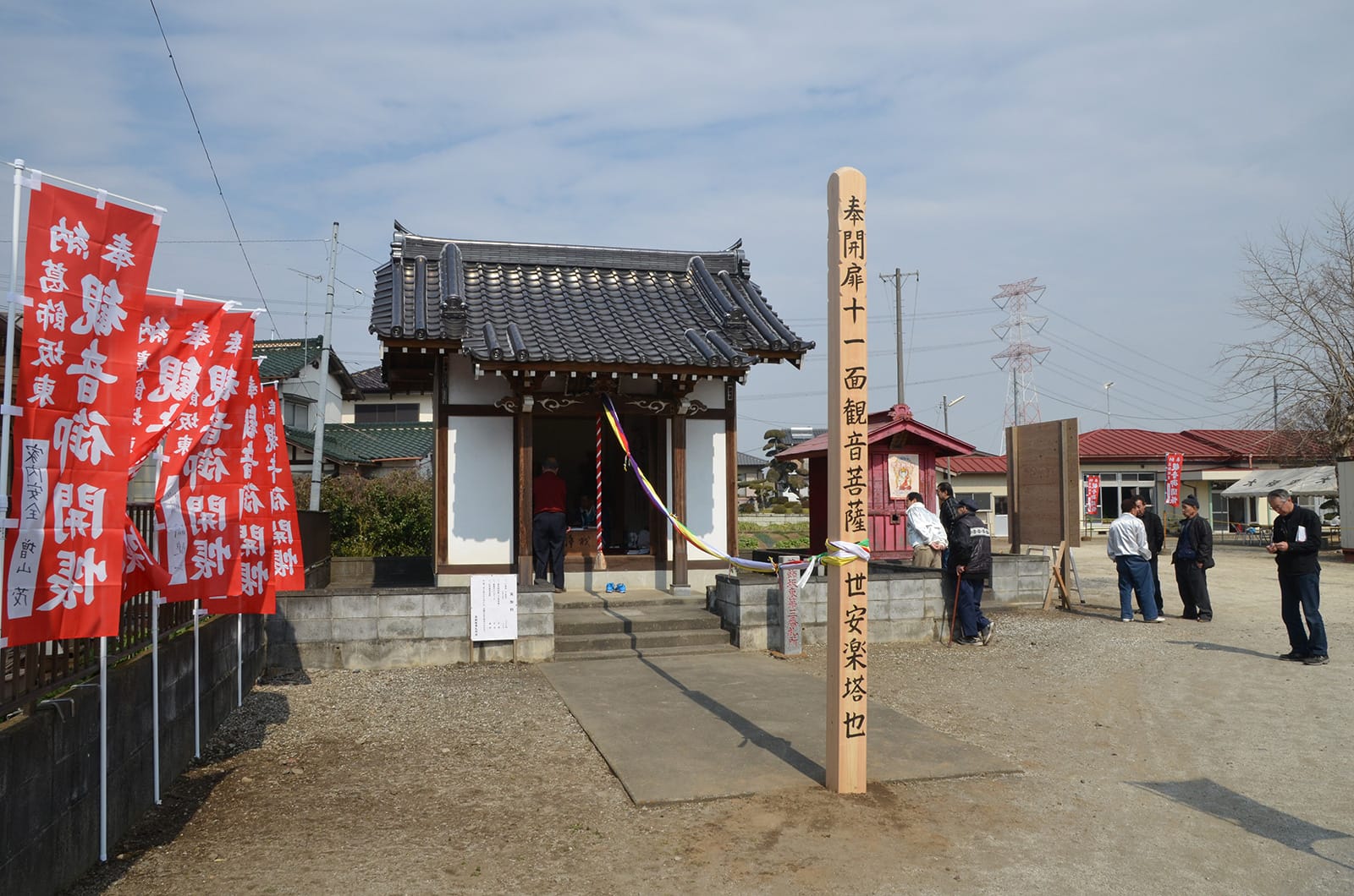 この寺は、下総国葛飾郡関宿町台町昌福寺の 末寺で、真言宗天福寺といいます。 明治維新の廃仏毀釈により廃寺となります。 現在は正徳寺の末寺で、境内には 立派な天神社(祭神・菅原道真公)が 祀られていて、左手に観音堂が 建てられています。 観音像は鋳造で、 約二〇センチメートルの大きさです。 ご本尊、十一面天神本地仏とありますが、 江戸時代の本地垂迹(ほんじすいじゃく)、 神仏混混淆(しんぶつこんこう)の 姿が今に残されている観音様です。