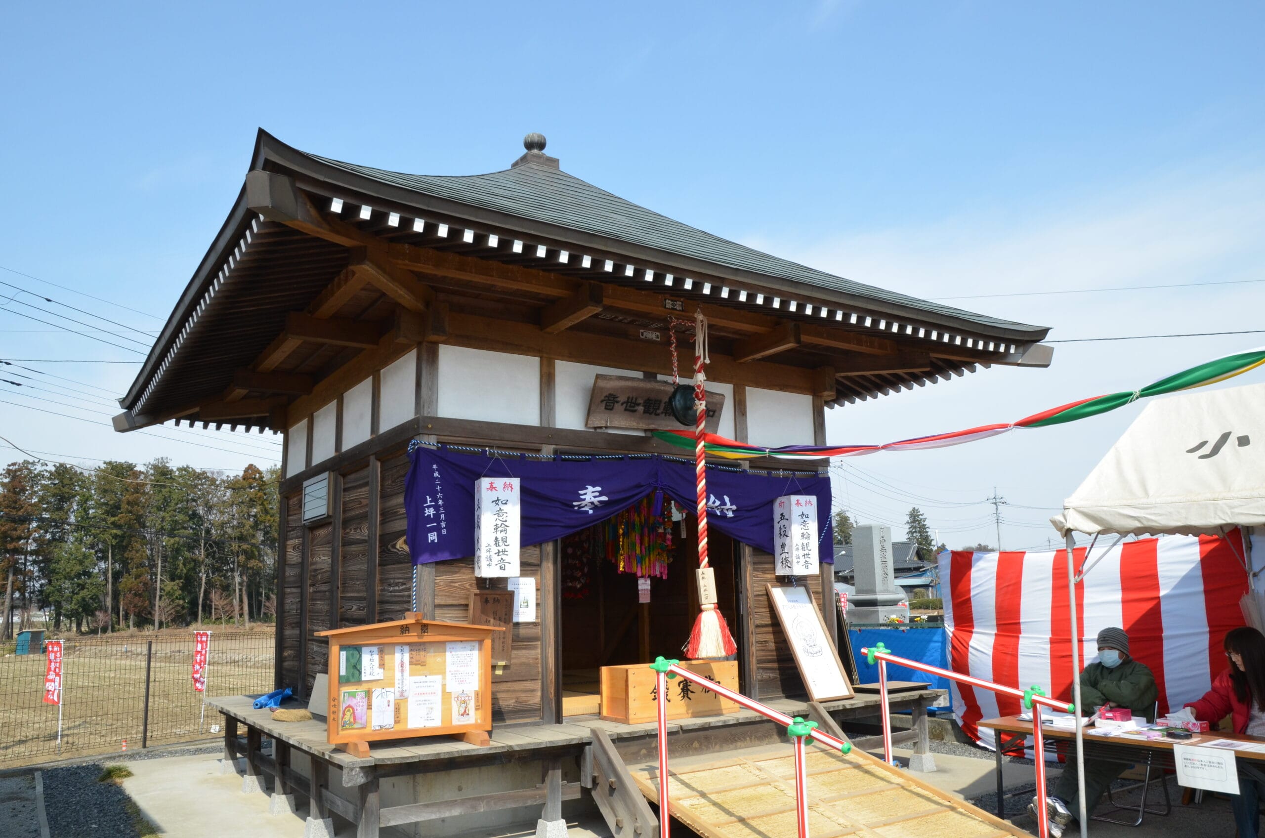 この如意輪堂は、 明治の自由民権運動家 舘野家の 屋敷内にありましたが、 現在小堤上坪に管理が ゆだねられた観音堂です。 平成十四年の開帳にあたり、 新築建立された観音堂は、 墓地隣に建てられています。 墓地隣には、延宝三年(一六七五)、 十一月十八日に建てられた 如意輪観音像があります。
